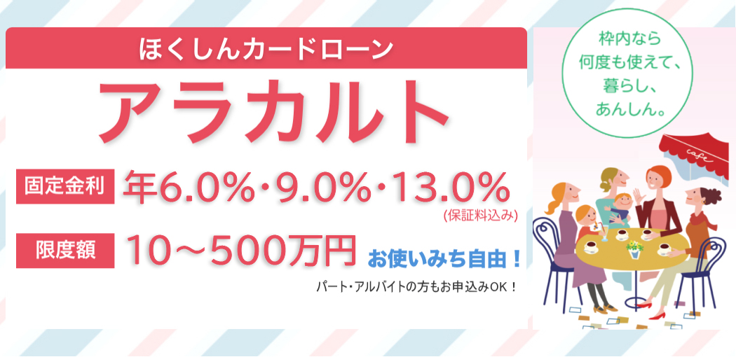 | ご融資金額 | 10万円、30万円、50万円、100万円、150万円、200万円、250万円、300万円、400万円、500万円 ※マイカーローンまたは教育ローンと同時申込みされる場合は、50万円を上限とします |